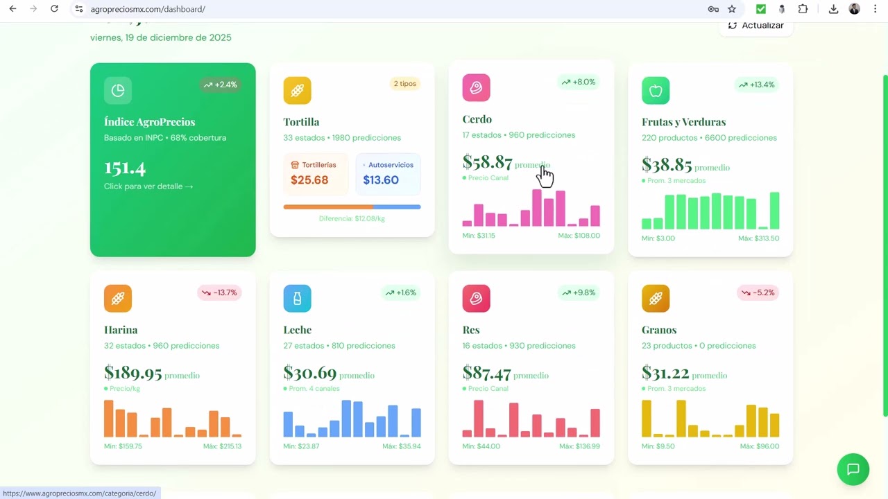 Consulta precios actualizados, compara mercados, recibe alertas, chatea con IA y anticipa tendencias. Para productores, comerciantes y distribuidores de México.